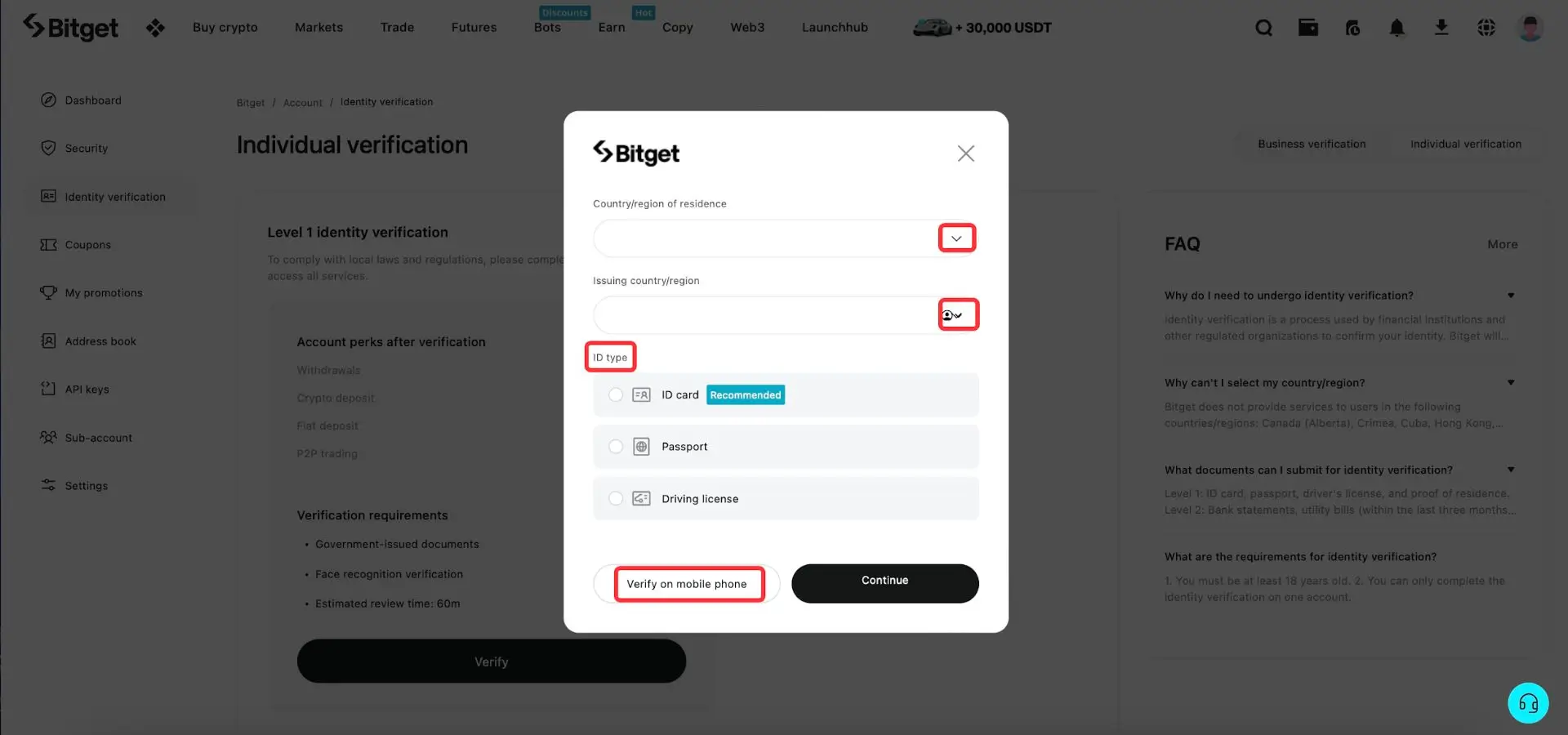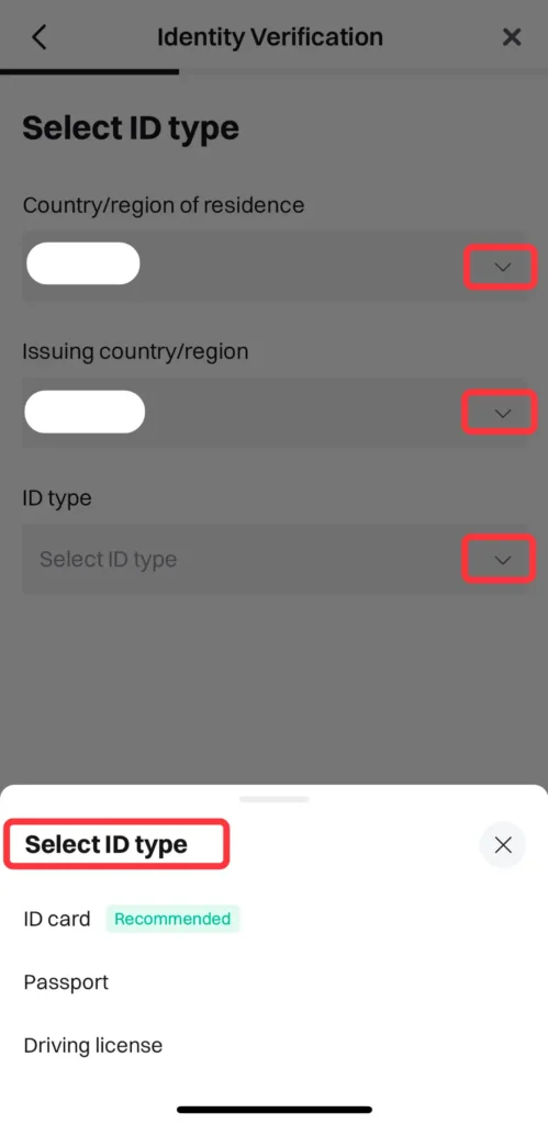 Kliknite na padajući meni kao što je označeno ispod da biste izabrali svoju zemlju/regiju prebivališta i zemlju/regiju izdavanja (vašeg identifikacionog dokumenta). Izaberite željeni tip identifikacije i kliknite na [Continue] da biste nastavili na laptopu ili [Verify on mobile phone]. Preporučujemo da izabarete opciju da verifikujete na mobilnom telefonu jer će vam biti potrebno da slikate svoj identifikacioni dokument.