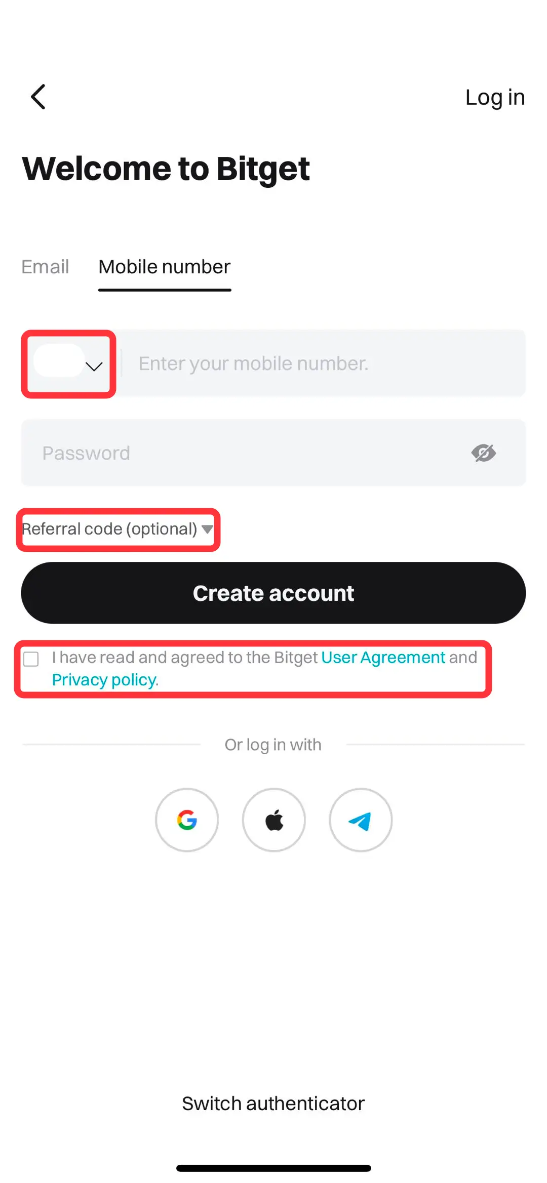 U ovom primeru ćemo objasniti proces registracije koristeći broj telefona. Kliknite na padajući meni označen ispod da biste pronašli pozivni broj svoje zemlje. Unesite svoj broj telefona, postavite lozinku, unesite referal kod (ako ga imate) i prihvatite Uslove korišćenja pre nego što kliknete na [Create account].