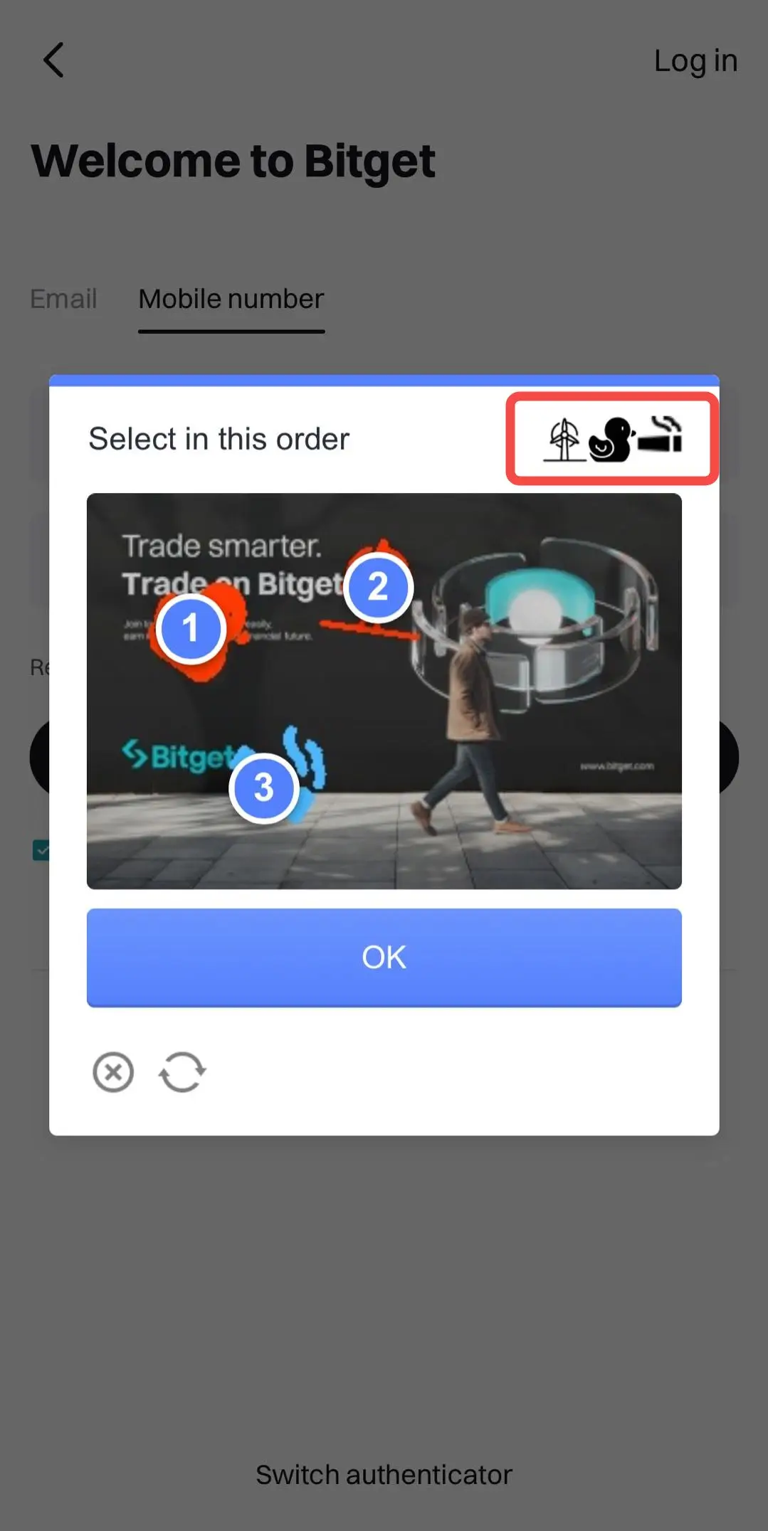 Morate da završite anti-bot verifikaciju. Proverite redosled simbola (kao što je dole označeno) i kliknite na svaki simbol na slici prateći taj hronološki red, a zatim kliknite na [OK].