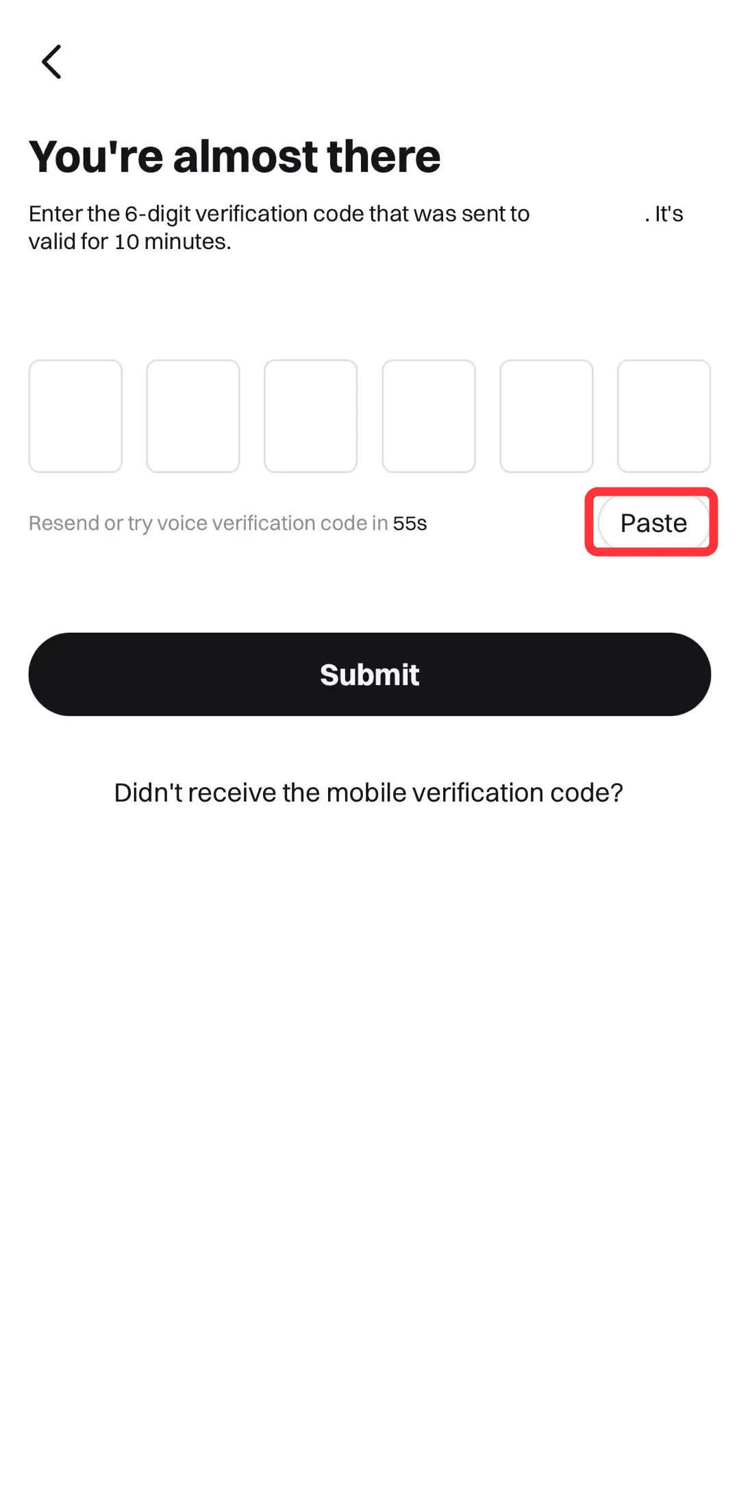 Nakon što završite anti-bot verifikaciju, Bitget će vam poslati verifikacioni kod putem SMS-a. Kod će važiti 10 minuta i potrebno je da ga kopirate i dodate u Bitget aplikaciju.