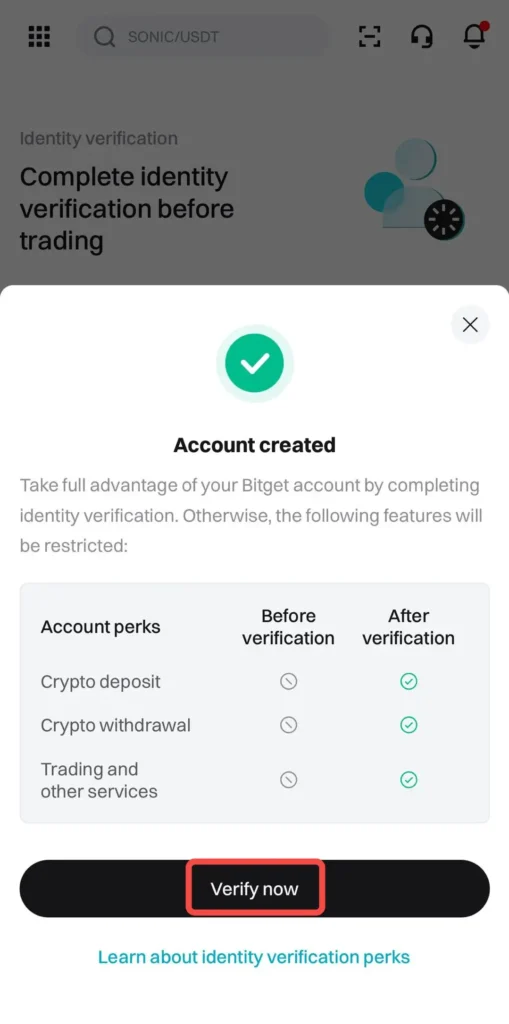 Radi zaštite korisnika i nesmetanog funkcionisanja, svi korisnici su obavezni da završe KYC proces (verifikacija identiteta). Kada unesete verifikacioni kod, automatski ćete biti prijavljeni na svoj Bitget nalog. Evo kako će to izgledati: