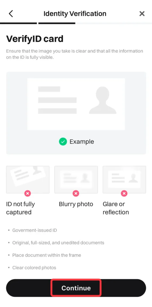 Kliknite na padajući meni kao što je označeno ispod da biste izabrali svoju zemlju/regiju prebivališta i zemlju/regiju izdavanja (vašeg identifikacionog dokumenta). Izaberite željeni tip identifikacionog dokumenta i kliknite na [Continue].