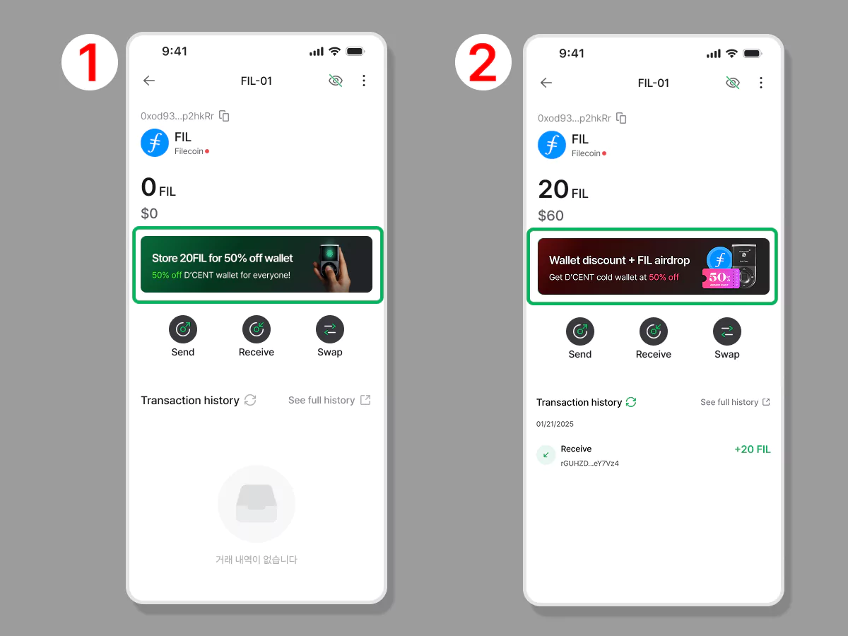 Kada napravite Filecoin ili Filecoin EVM račun, videćete baner broj 1 (pogledajte sliku ispod). Ako zatim položite (deponujete) minimalno 20 FIL, pojaviće vam se baner broj 2. Klikom na taj baner možete kupiti D’CENT novčanik sa 50% popusta.