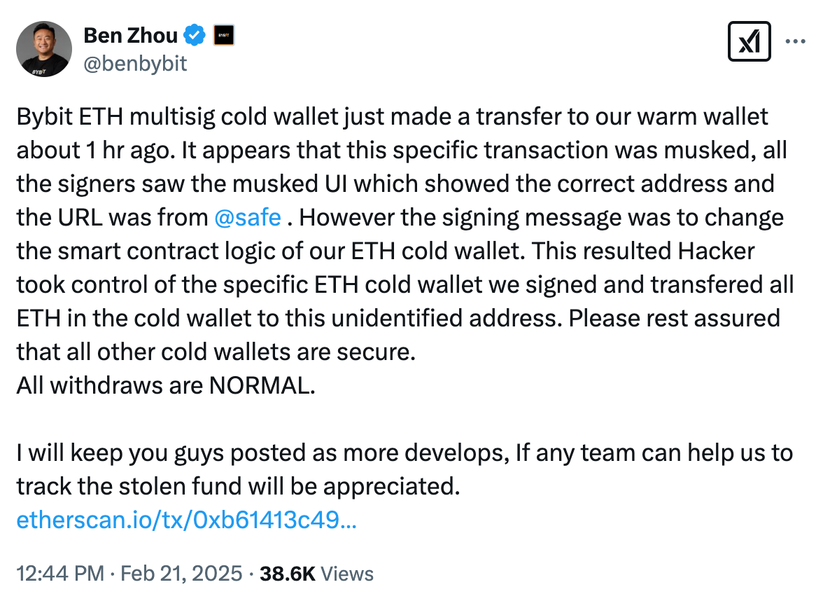 Ben Zhou, suosnivač i izvršni direktor Bybit-a, potvrdio je incident, navodeći da je transakcija iz “multisig” novčanika menjačnice u “hot” novčanik bila maskirana da izgleda legitimno, ali je sadržala zlonamerni kod koji je izmenio logiku pametnog ugovora novčanika i omogućio preusmeravanje sredstava.