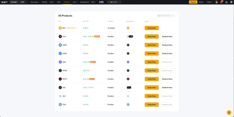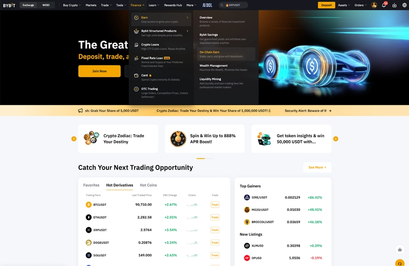 Prijavite se na svoj Bybit nalog, zatim postavite pokazivač miša preko kartice Finance. U okviru opcije Earn odaberite On-Chain Earn.