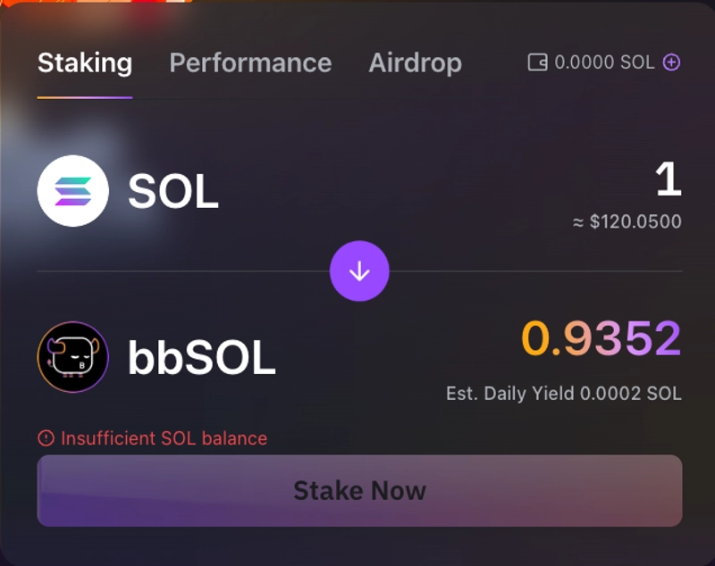 Unesite količinu SOL-a koju želite da uložite ili količinu bbSOL-a koju želite da dobijete. Proverite da li ste tačno popunili sva polja, zatim kliknite na dugme Stake Now da biste završili proces.