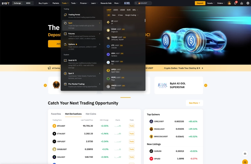 Prijavite se na svoj Bybit nalog, pređite kursorom preko kartice Trade, zatim kliknite na Spot.