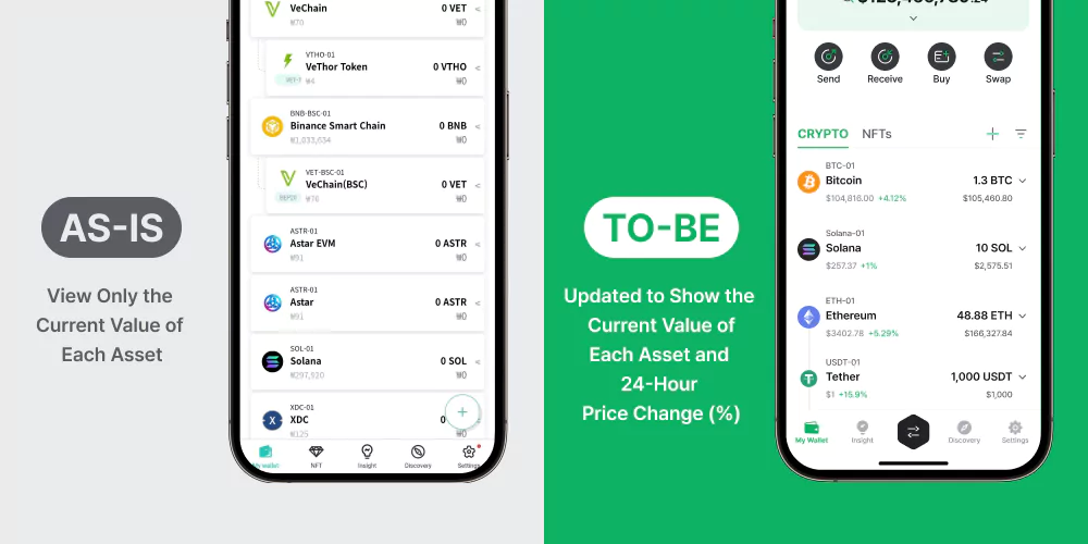 Na ekranu “My Wallet”, korisnici mogu da vide ne samo trenutnu cenu svojih kriptovaluta već i procentualnu promenu cene u poslednjih 24 časa.