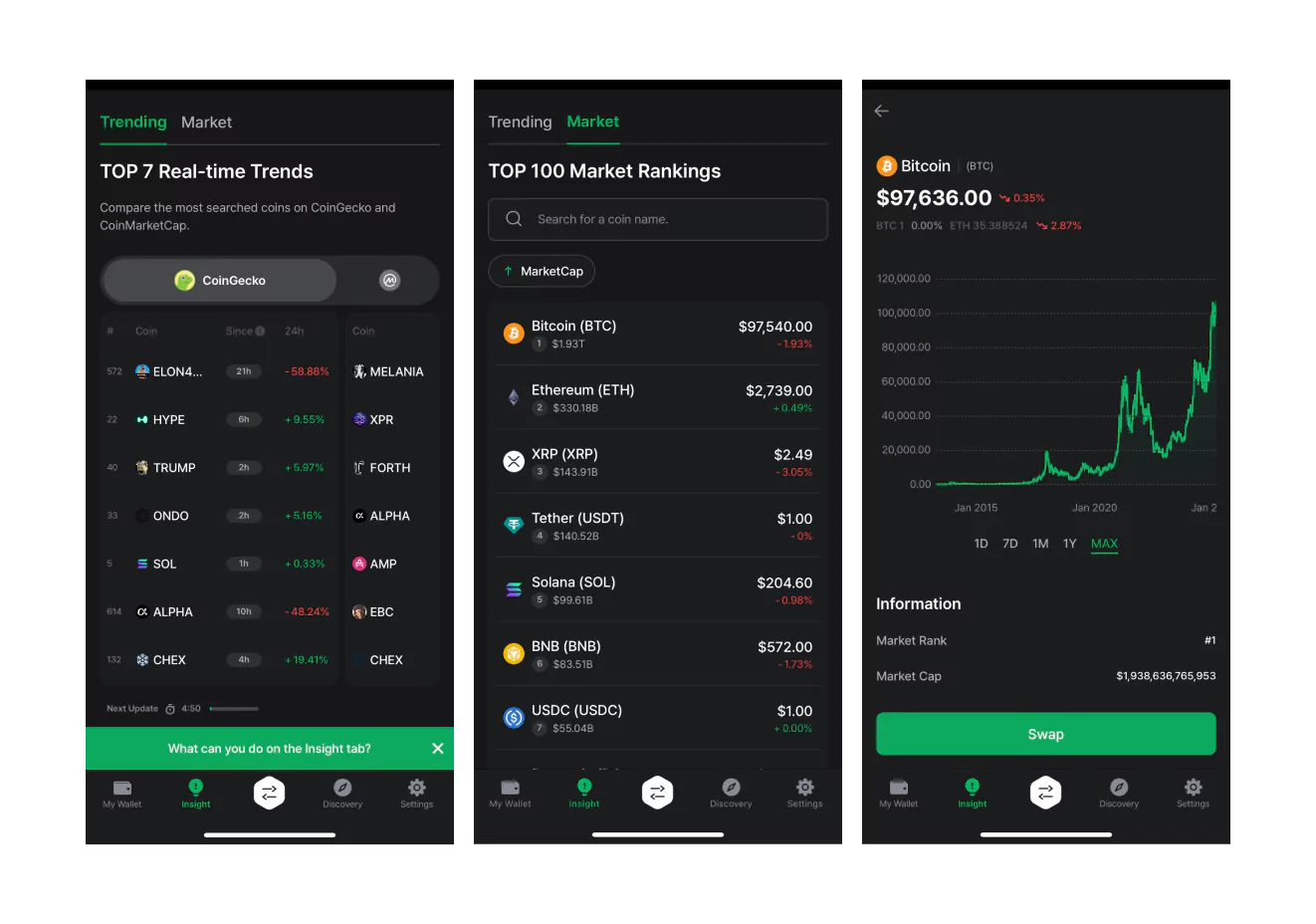 U brzom svetu kripto ulaganja, korisnici mogu brzo da uoče koje imovine privlače pažnju i kako se tržište menja. Ako odluče da investiraju, mogu izvršiti swap (razmenu) kriptovaluta direktno u aplikaciji.